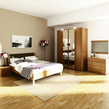 BEAUTY Уравновешенная композиция, выполненная в мягкой текстуре «орех». Изголовье кровати - искусственная кожа темно-коричневого цвета. Изящные светильники кровати и стильная подсветка шкафа наполнят любой интерьер «волшебным», приятным для глаз, приглушенным светом.