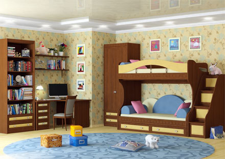 51.202.05 Стелаж - 1 шт. 51.502.01 Стол угловой - 1 шт. 51.607.02 Полка - 2 шт. 51.202.02 Шкаф двухдверный - 1 шт. 51.102 Кровать 2х-ярусная - 1 шт. 51.101.02 Кровать тахта - 1 шт. 51.102.02 Лесенка - 1 шт.