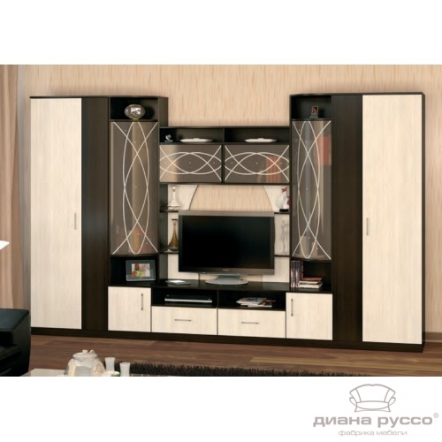 центральная секция с витринами и открытыми нишами для книг и посуды, тв и видео аппаратуры, распашными дверцами и выдвижными ящиками на металлических направляющих (ниша для ТВ 1200*900 мм)