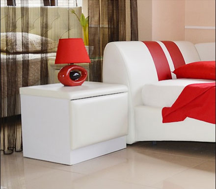 Прикроватная тумба выполняется из ЛДСП цвета: дуб млечный, венге или пластик цвет белый глянец. Верхняя часть и фасад тумбы из эластичной экокожи. Тумба может комплектоваться стеклом (матовое, прозрачное, тёмно-коричневое).